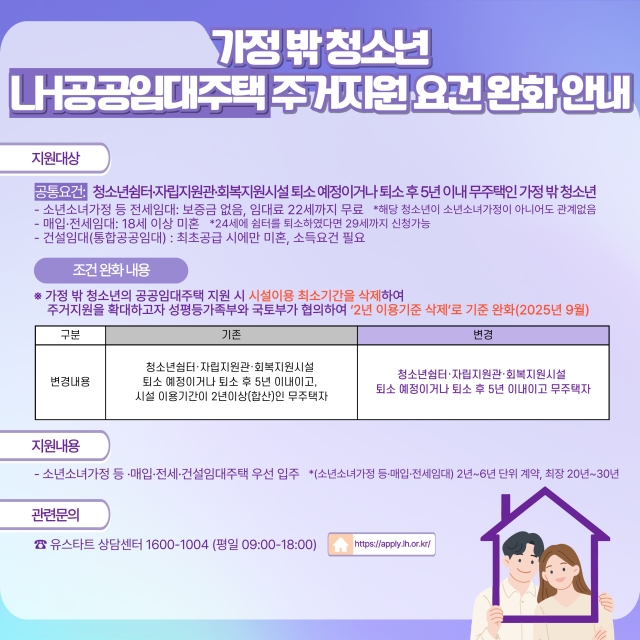 가정 밖 청소년 LH공공임대주택 주거지원 요건 완화 안내
